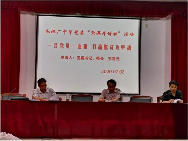 7月2日晚,六安市毛坦厂中学党委组织全体党员在科教馆报告厅开展“党课开讲啦”活动。活动由校党委副书记周忠主持。校党委书记、校长韦发元为全体党员上了一堂主题为“一名党员一面旗,打赢脱贫攻坚战”的党课。